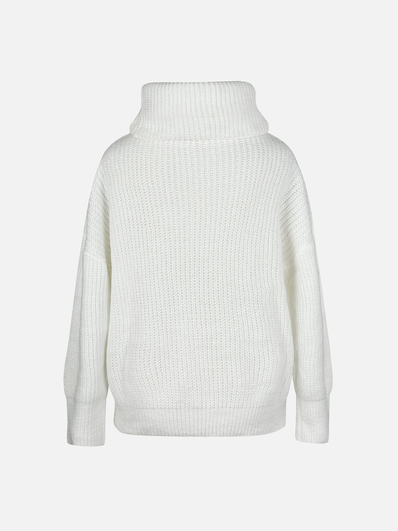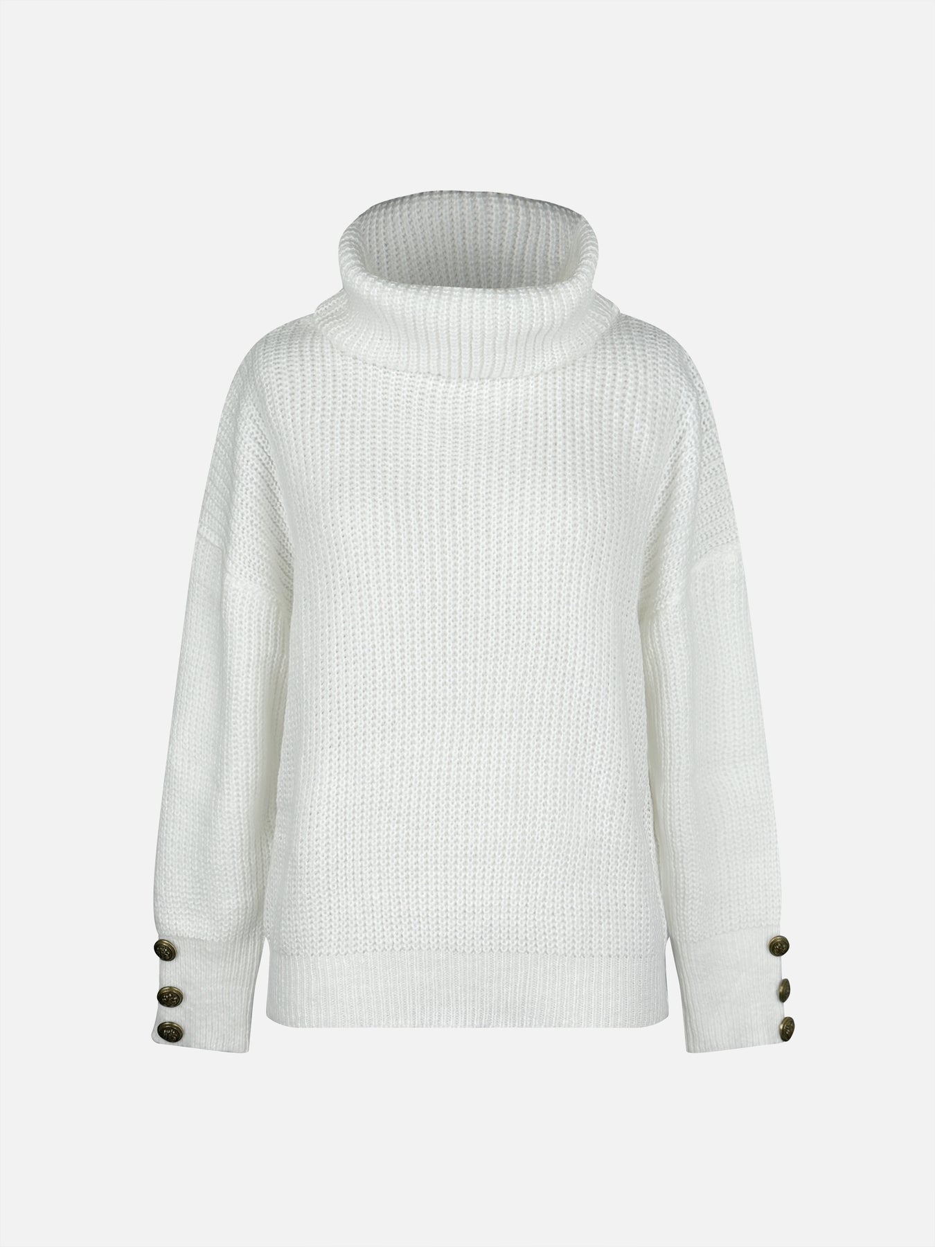 Poznaj Nolia™ – miękki, ciepły sweter z wysokim golfem i eleganckimi, dekoracyjnymi guzikami przy ramieniu.
